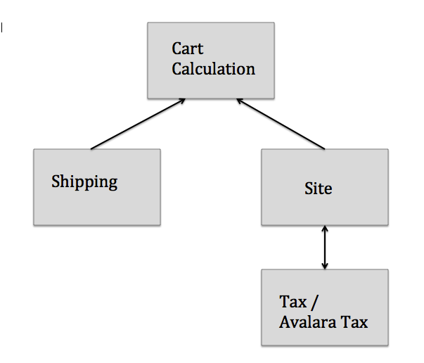 Cart Calculation is dependent on three services: Site, Tax/Avalara Tax, and Shipping. Cart Calculation calls the Site service to retrieve the tax configuration, specifically the tax URL. The service then uses the tax URL to call the corresponding tax service (Avalara Tax or Tax) to calculate the tax for the items in the cart. Tax codes can be configured in the Tax service and used to assign different tax amounts to items. If there are different taxes applied to the cart, such as a standard tax rate and different tax codes, the service calculates the amount for the different taxes separately before adding all the totals together to give you a single tax total.