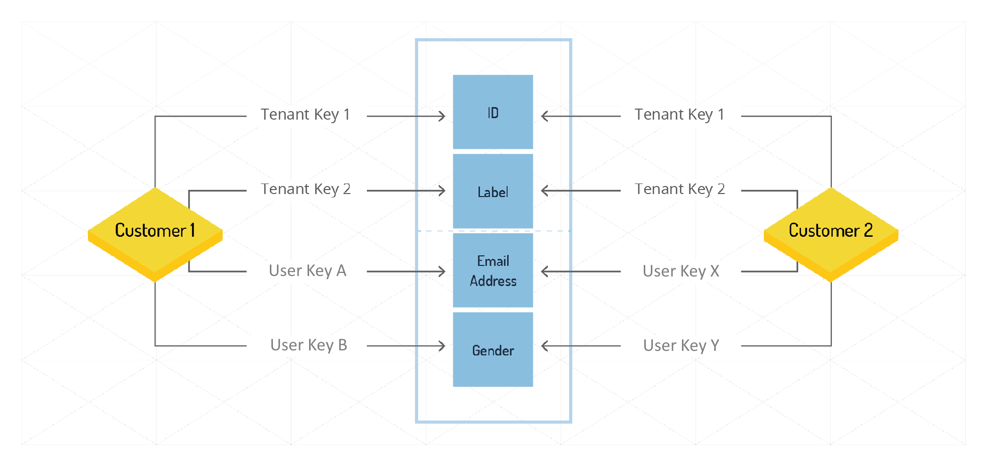 Genderdata in the diagram is encrypted withUser Key Bfor one user, and withUser Key Yfor another user.